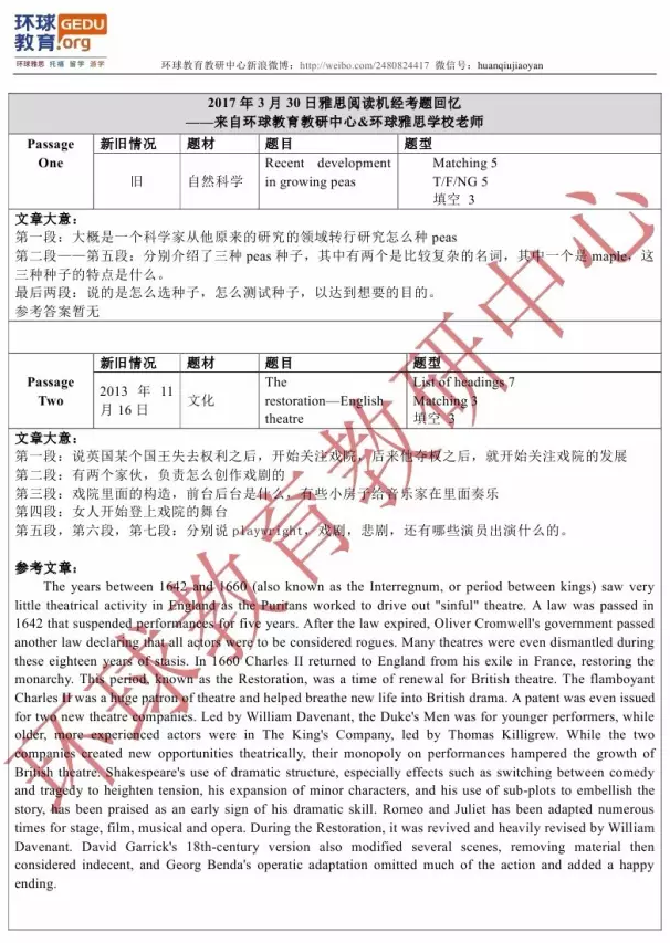 环球教育(原环球教育)教研中心的名师们此次为大家送上2017年3月30日雅思阅读考试回忆及答案,希望对大家备考雅思有所帮助!