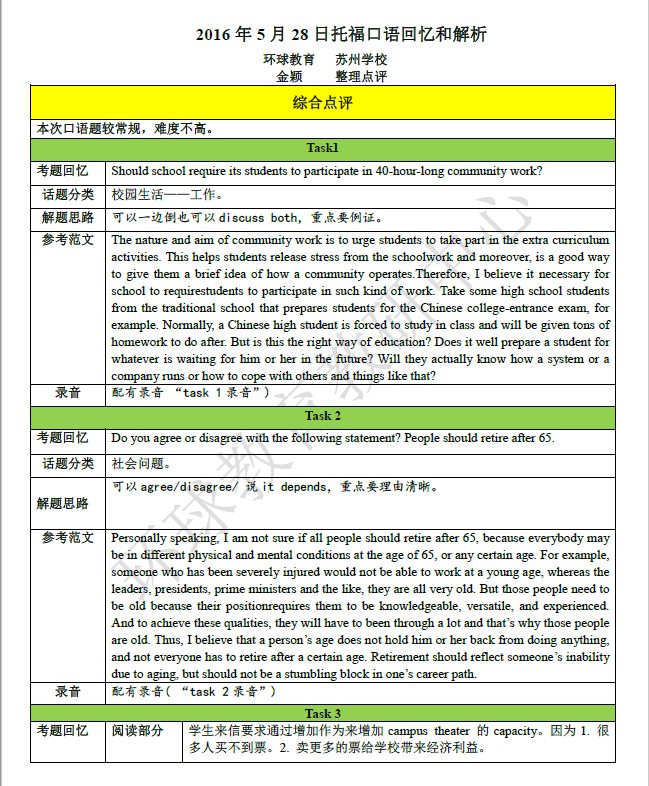 以下是环球教育(原环球教育)教研中心为大家带来的“2016年5月28日托福考试听说读写全科回忆”,希望对大家有所帮助!